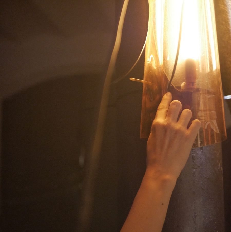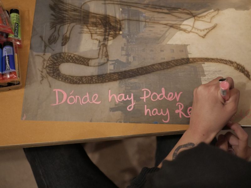 Una sala con luz tenue, con los trabajos artísticos iluminados y conectados entre sí mediante fibras. La entrada se realiza a través de un pasillo (hecho con cortinas) donde se exponen palabras o frases que llaman la atención del público. Después de la exposición, en la sala hay otro espacio convivial en el que las asistentas pueden hablar y compartir sus experiencias, así como recopilar información de nuestra “biblioteca de recursos”.