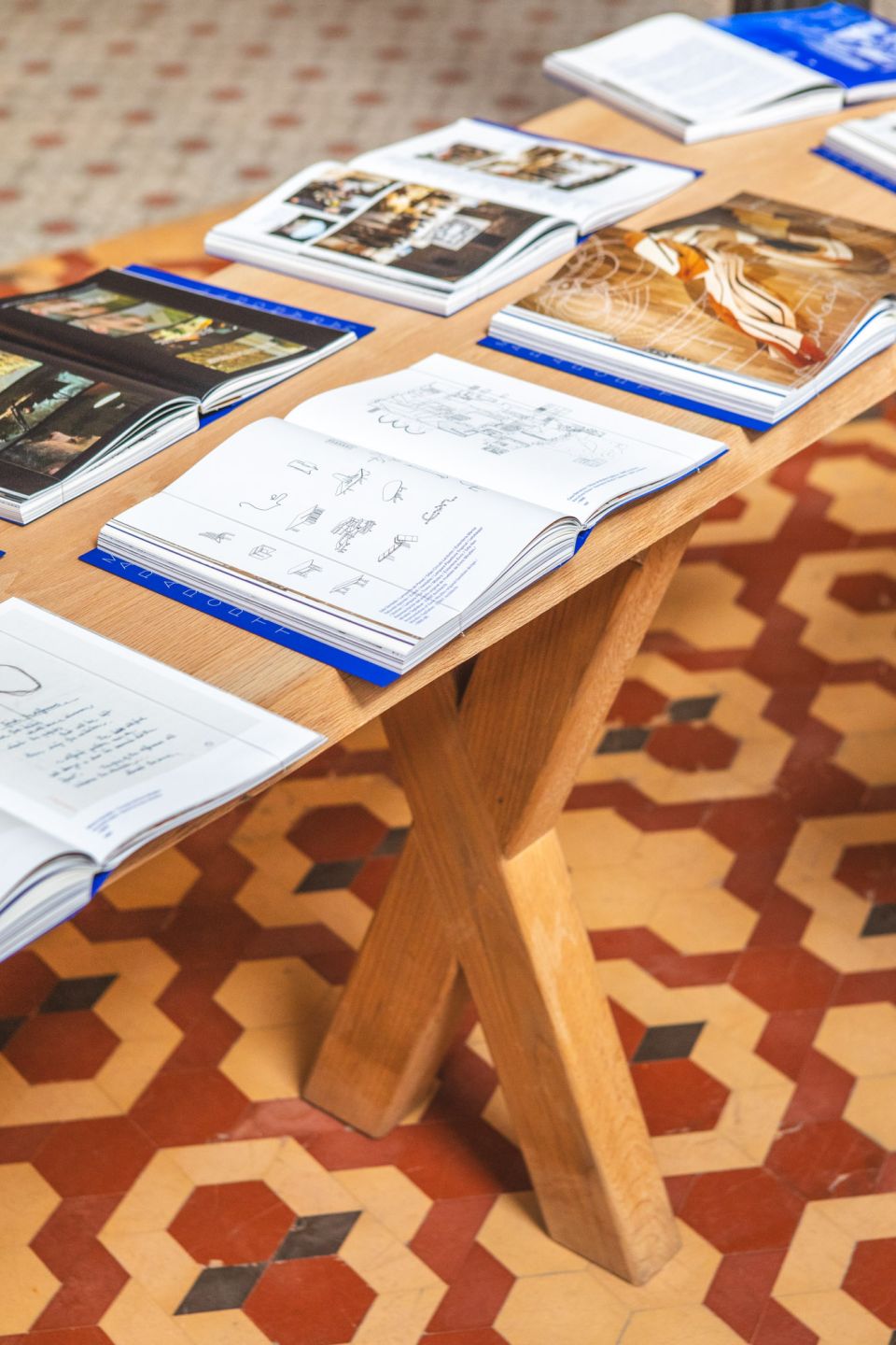 Para materializar esta lectura en movimiento, los libros descansan sobre algunas de las piezas de mobiliario más emblemáticas diseñadas por Enric Miralles y Benedetta Tagliabue, en secuencia: Inestable, Dolmen, dos Troncs, Tropical, Lelukappi y Mystery, creando una coreografía donde libros y muebles se entrelazan.